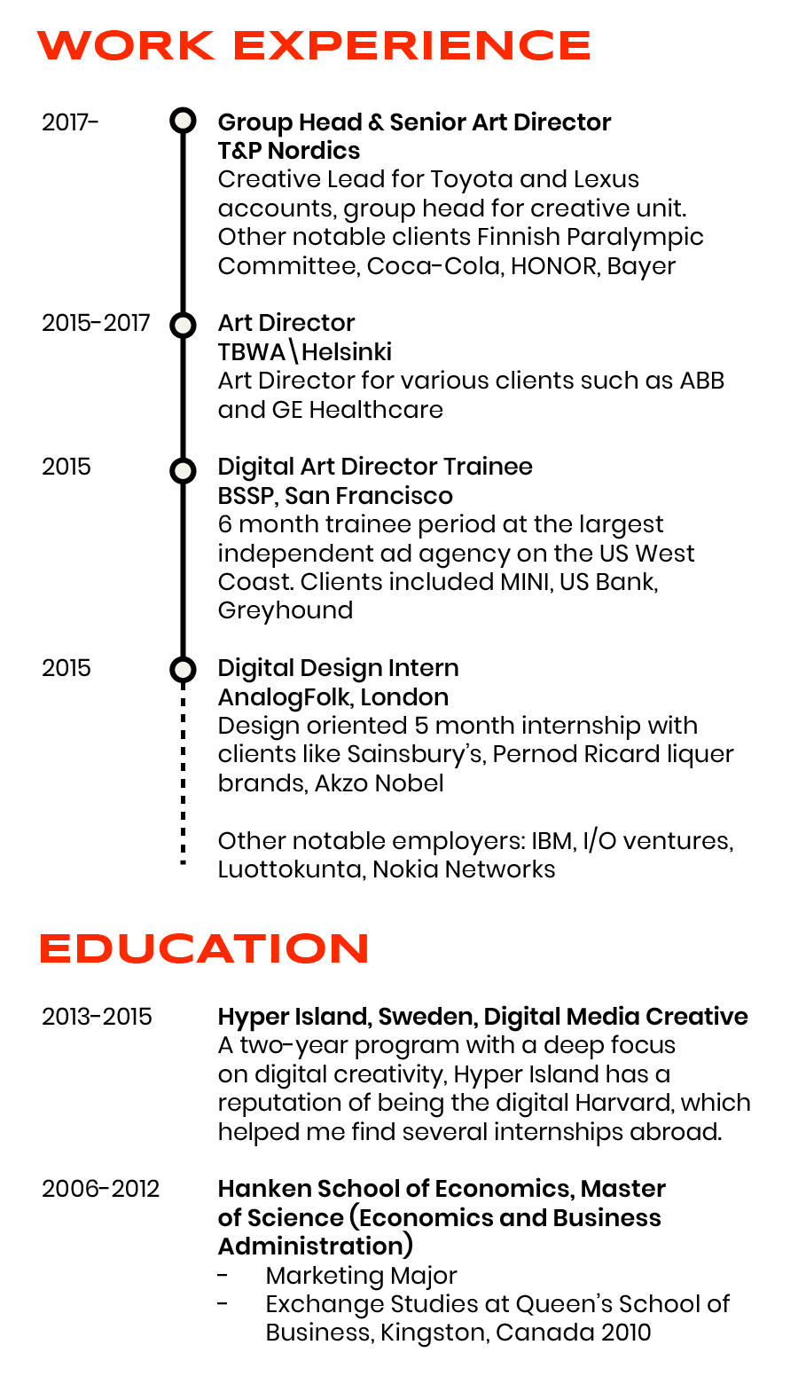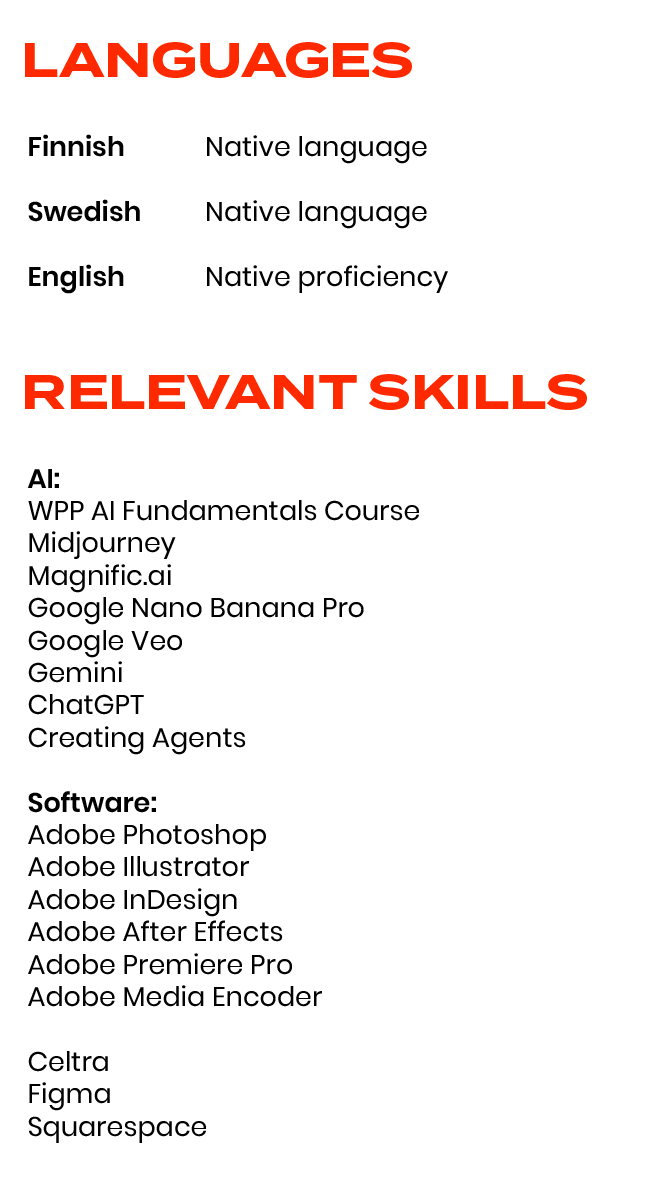 So I leave IBM to study digital creativity at Hyper Island in Sweden, which again takes me to agencies in London and San Francisco. Fast forward to today, I’m back in Finland, where I’ve spent the past 10 years perfecting my craft at different agencies as a Senior Art Director.