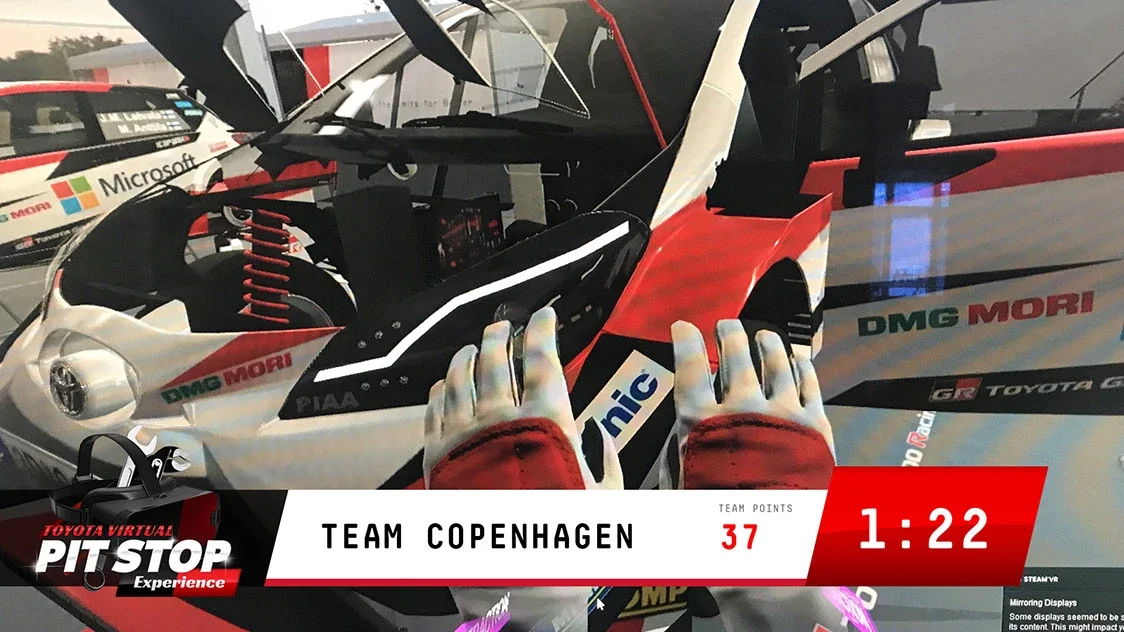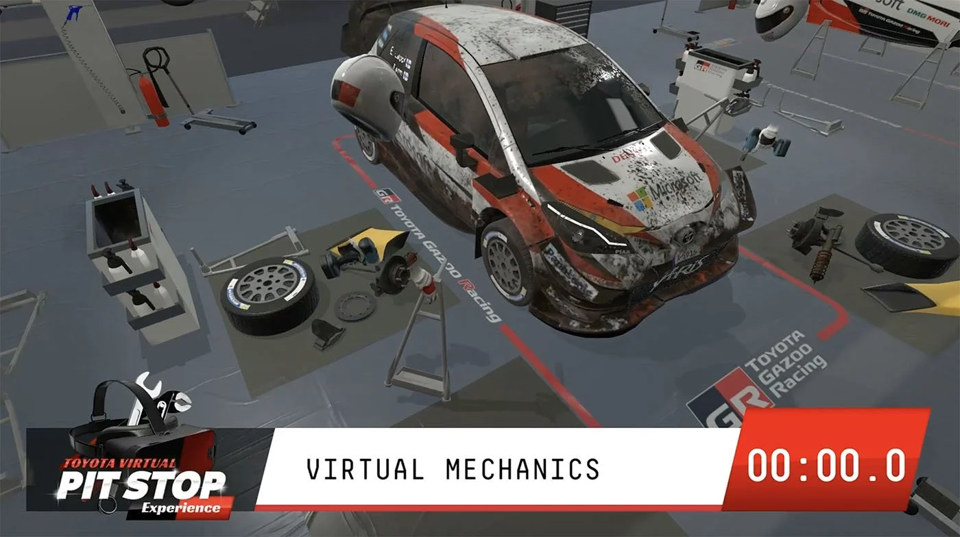 The Toyota Virtual Pitstop Experience was born. A VR game where two players at a time have to show their mechanics skills, and do necessary repairs to a banged up virtual Toyota rally car.