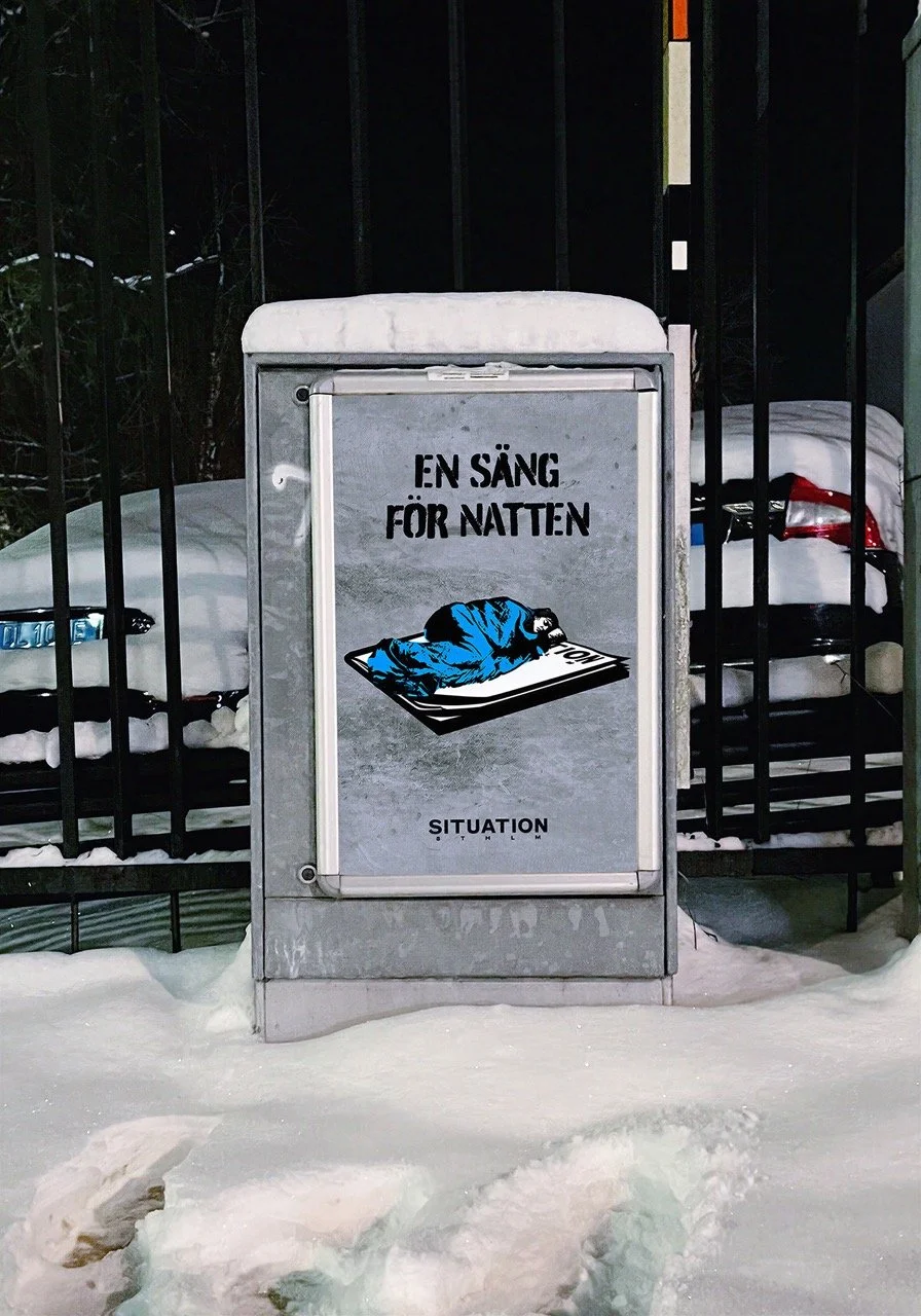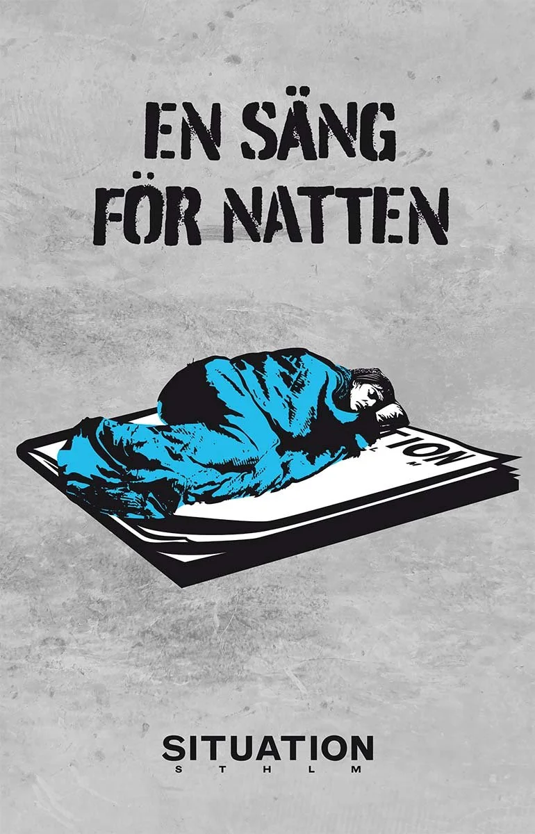 The newspaper was offered a free media placement in an all too fitting place for the homeless – on electric boxes around the city, slightly below people’s line of vision. A campaign was needed that was both eye-catching, thought provoking and street credible. I illustrated and art directed three posters that symbolizes what selling the magazine means for the homeless; Tak över huvudet (a roof over my head), En väg tillbaka (a road back) and En säng för natten (a bed for the night).